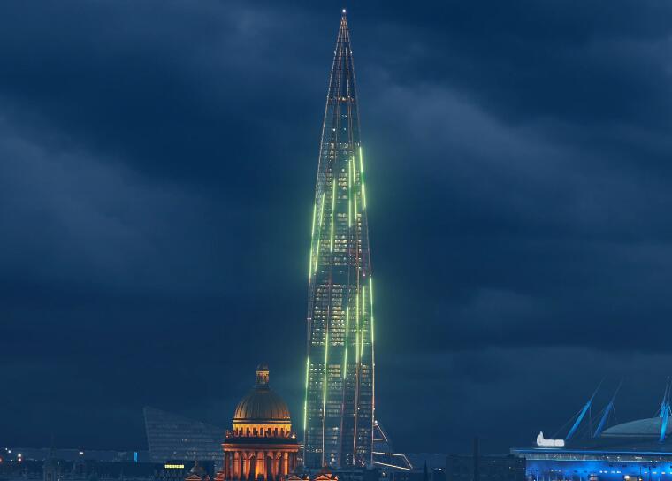 В День полного освобождения Ленинграда от блокады «Лахта Центр» включил особую подсветку. Башня окрасилась в цвета ленты Ленинградской Победы.