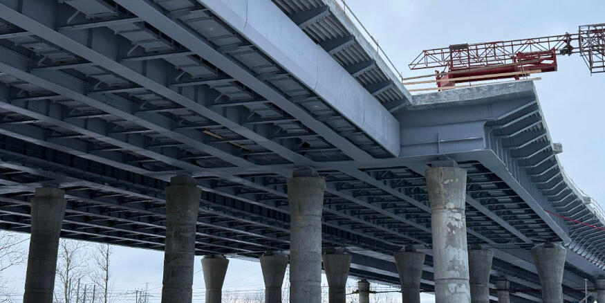 На объекте возводят опоры и монтируют пролетные конструкции. Также устанавливают железобетонные плиты.